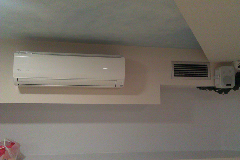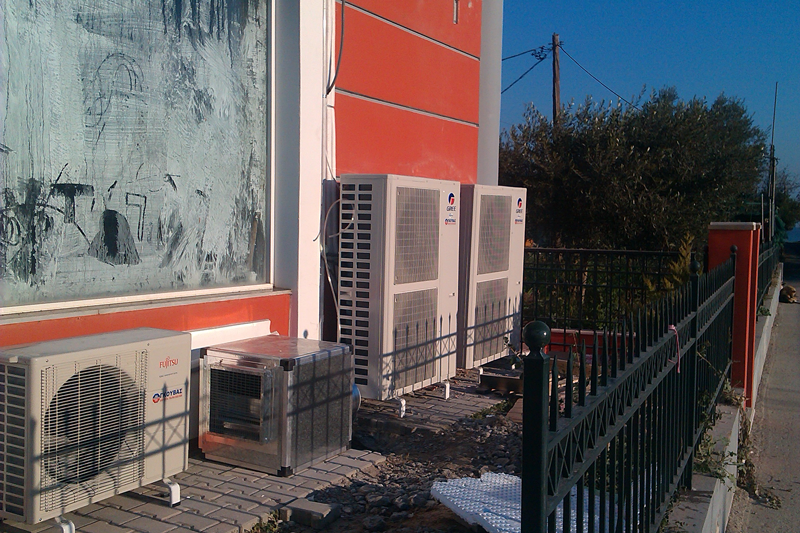 2 Καναλάτες μονάδες GREE 45000 BTU με εύκαμπτους αεραγωγούς για το ισόγειο και ένα κλιματιστικό τύπου split Fujitsu 24000 BTU για το υπόγειο.